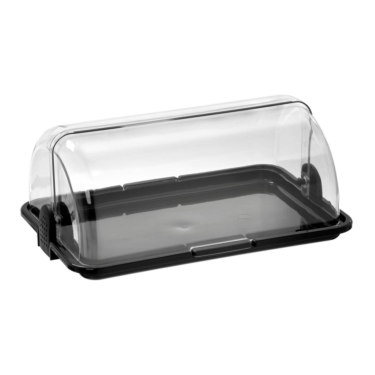 Buffetvitrine ohne Kühlung für Buffets. Der transparente Rolldeckel ermöglicht die Bedienung von beiden Seiten und bietet einen direkten Blick auf die servierten Speisen. Farbe: Schwarz. Abnehmbarer Deckel. Bodenfläche: B 420 x H 270 mm. Einfache Handhabung und Reinigung. Material: Robuster, transparenter Kunststoff. Abmessungen: 465 x 315 x 195 mm. Gewicht: 1,43 kg.