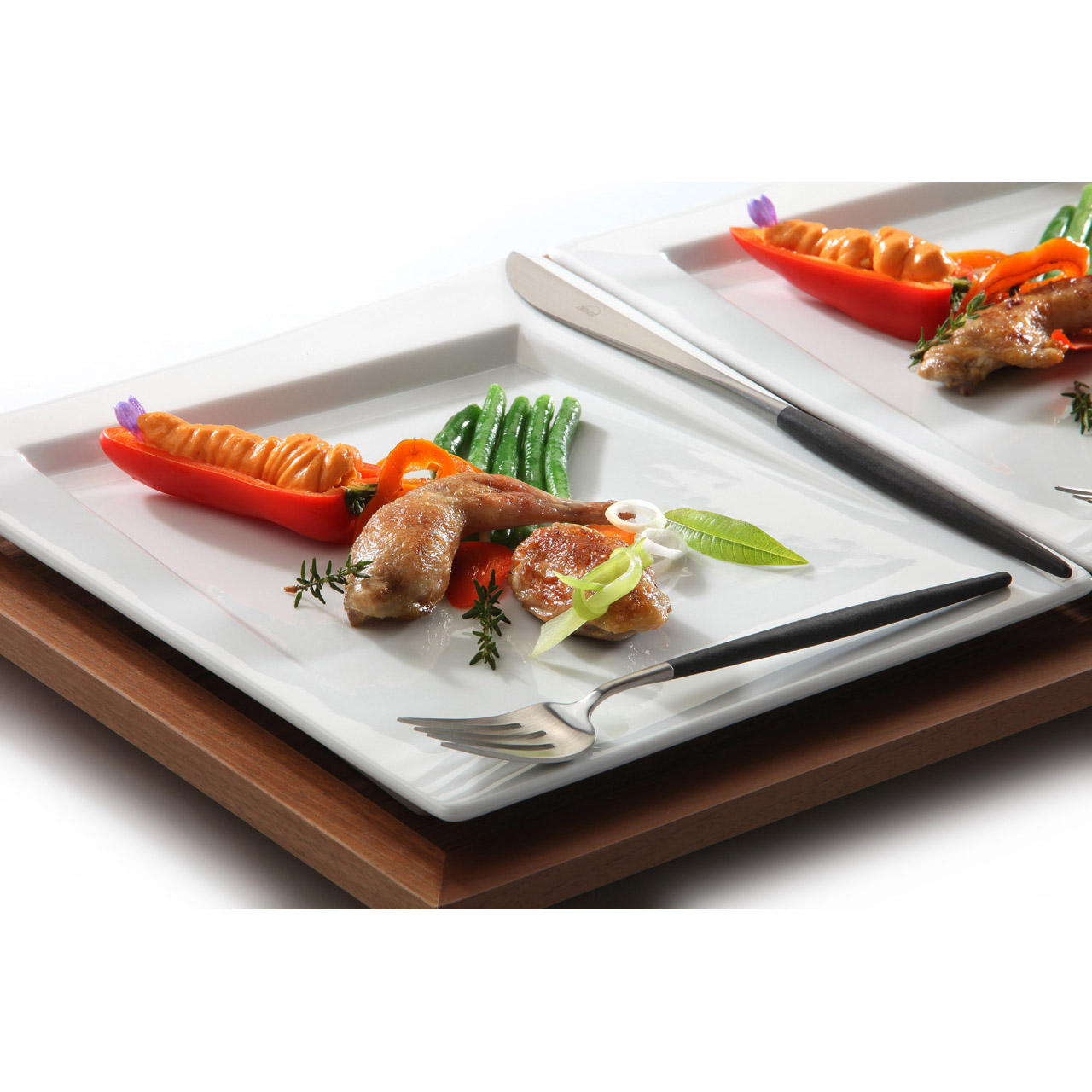 Porzellanteller 27 x 27 cm. Wir können ein Basistablett-Modul einbauen. Geeignet zum Servieren von Speisen bei Banketten.