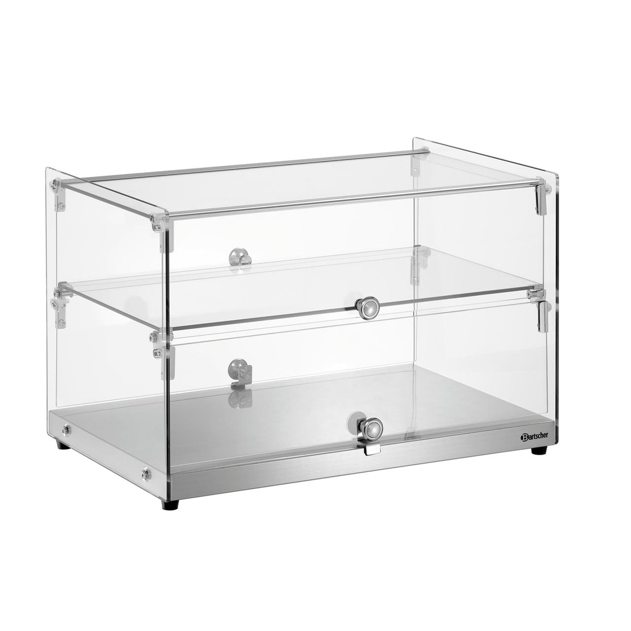 Zweistöckige Selbstbedienungsvitrine. Jede Etage verfügt über separat zu öffnende Türen. Herausnehmbarer Glasboden. Material: Edelstahl mit Glas. Maße des oberen Bodens: B 540 x T 320 x H 120 mm, Maße des unteren Bodens: B 540 x T 320 x H 150 mm. Geeignet für Konditoreien, Cafés und Restaurants.