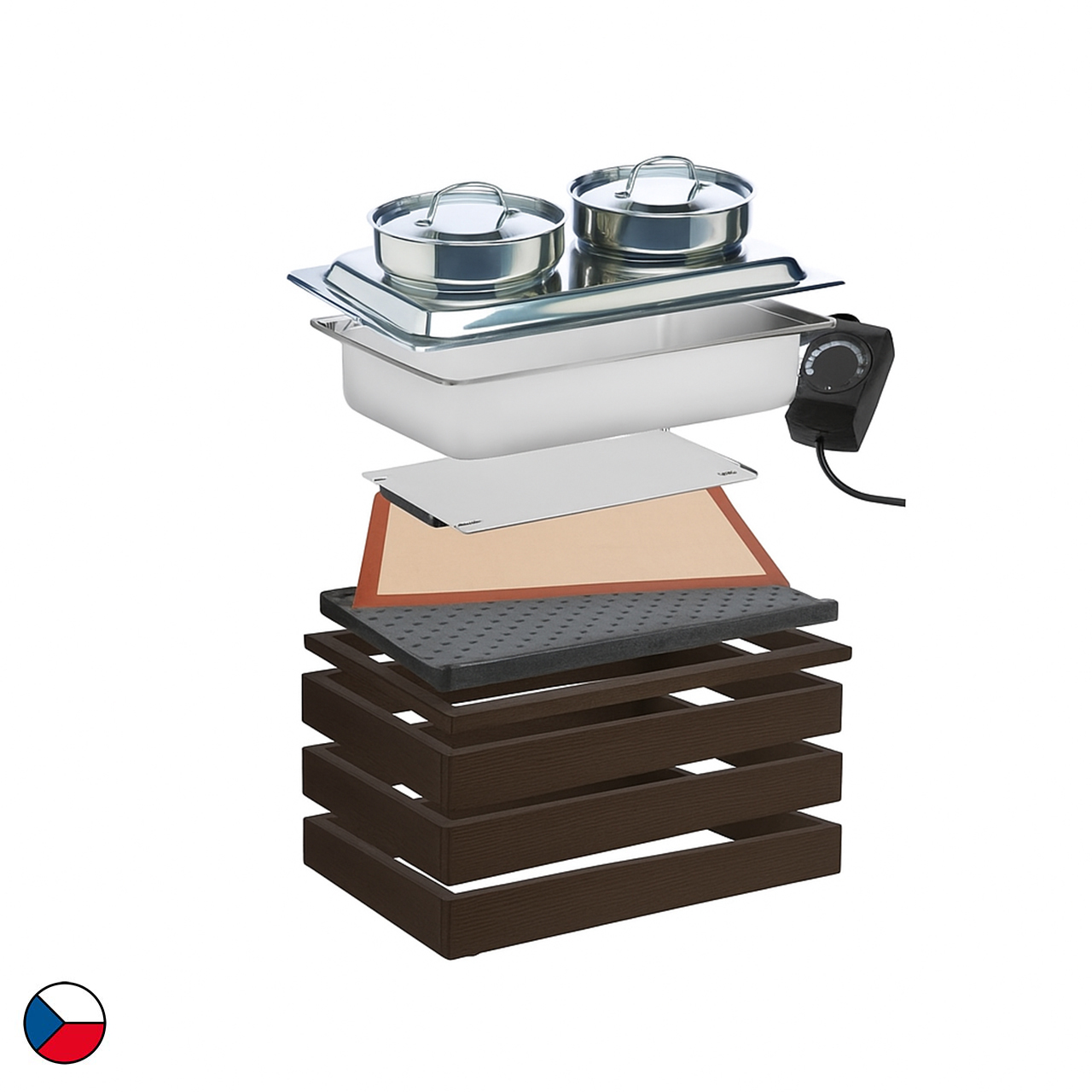 Der beheizte Suppenmodul ist die Komplettlösung für ein warmes Buffet. Dieses Set besteht aus 3 Basisrahmen (58 x 40,5 x 6,5 cm), ergänzt durch einen oberen Holzrahmen für das Wasserbad sowie weiteres Zubehör: schwarze thermoisolierende Unterlage, Silikoneinsatz, elektrische Heizung mit 400 W, 1 x Suppeneinsatz mit zwei Suppenbehältern a 4,5 l, 2 x Suppenkelle. Die dunkle Holzoptik fügt sich dezent in jede Umgebung ein – ob Hotelfrühstücksbereich, Firmenbuffet oder Catering-Events. Dank des einfachen modularen Systems lässt sich das Set leicht transportieren, kombinieren und an verschiedene Räume anpassen.