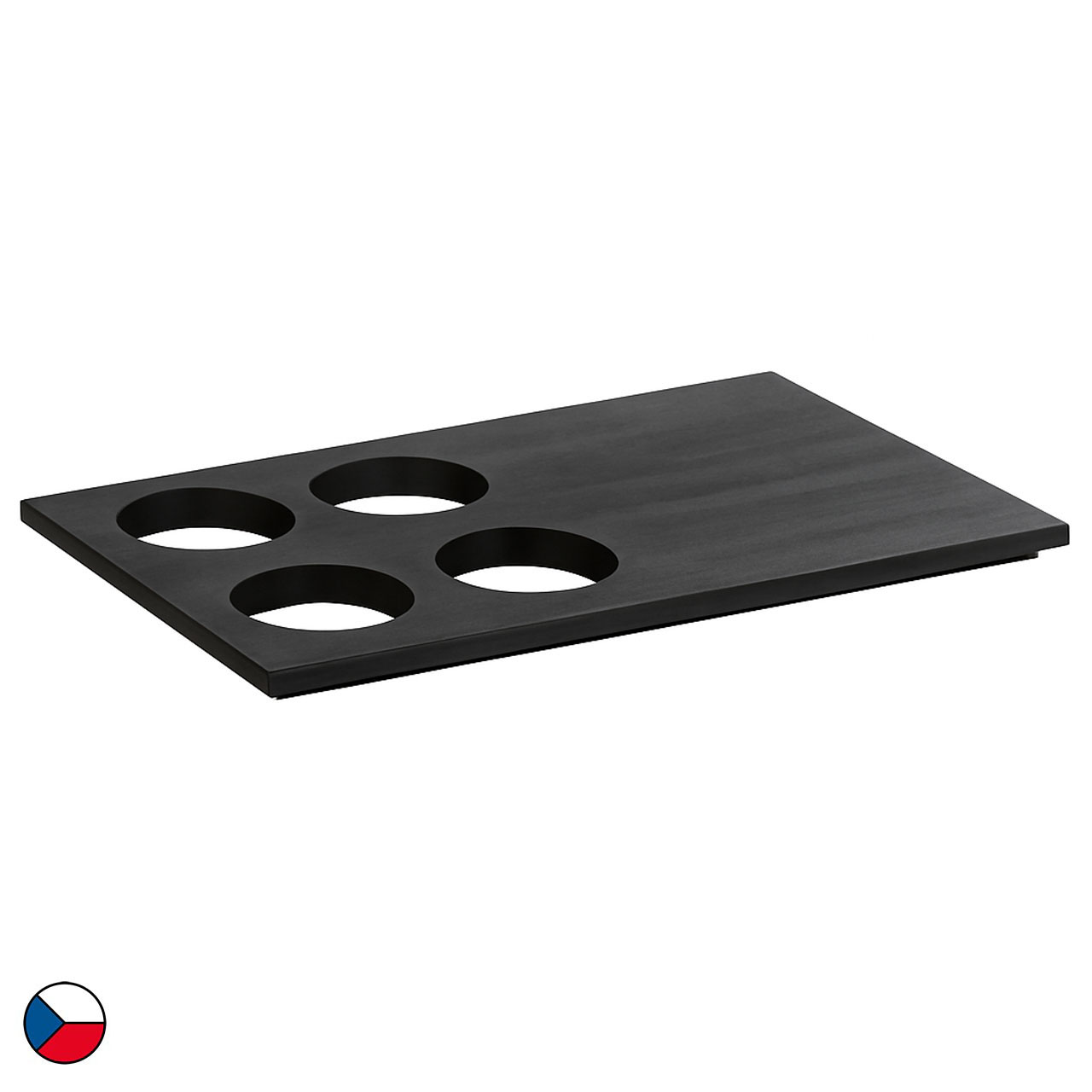 Der Aufsatzaufsatz der Größe GN 1/1 mit vier Löchern am Rand kann in den Aufsatzrahmen eingeschoben werden. Die Löcher haben einen Durchmesser von 10,5 cm, in die Besteckkörbe oder Karaffen mit entsprechendem Durchmesser eingesetzt werden. Die Verlängerung besteht aus Buchenholz, schwarzes Buchenholz gebeizt. Die Deckschicht ist mit einem unbedenklichen, für den Kontakt mit Lebensmitteln geeigneten Lack lackiert.