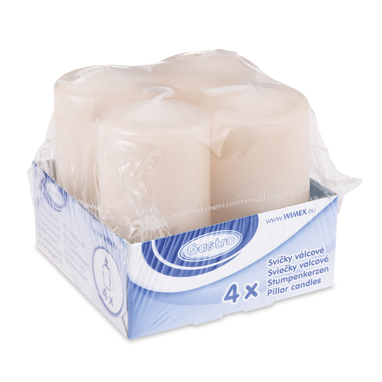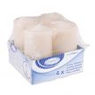 Zylindrische Kerze. Durchmesser 5 cm, Höhe 10 cm. Brenndauer ca. 15 h. In einer Packung mit 4 Stück.