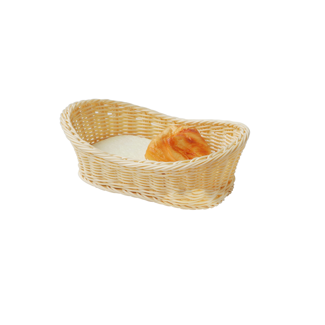 Länglicher Korb aus leichtem Polypropylen-Rattan mit den Maßen 25 x 15 x 8 cm. Einfache Wartung, kann in der Spülmaschine gewaschen werden.