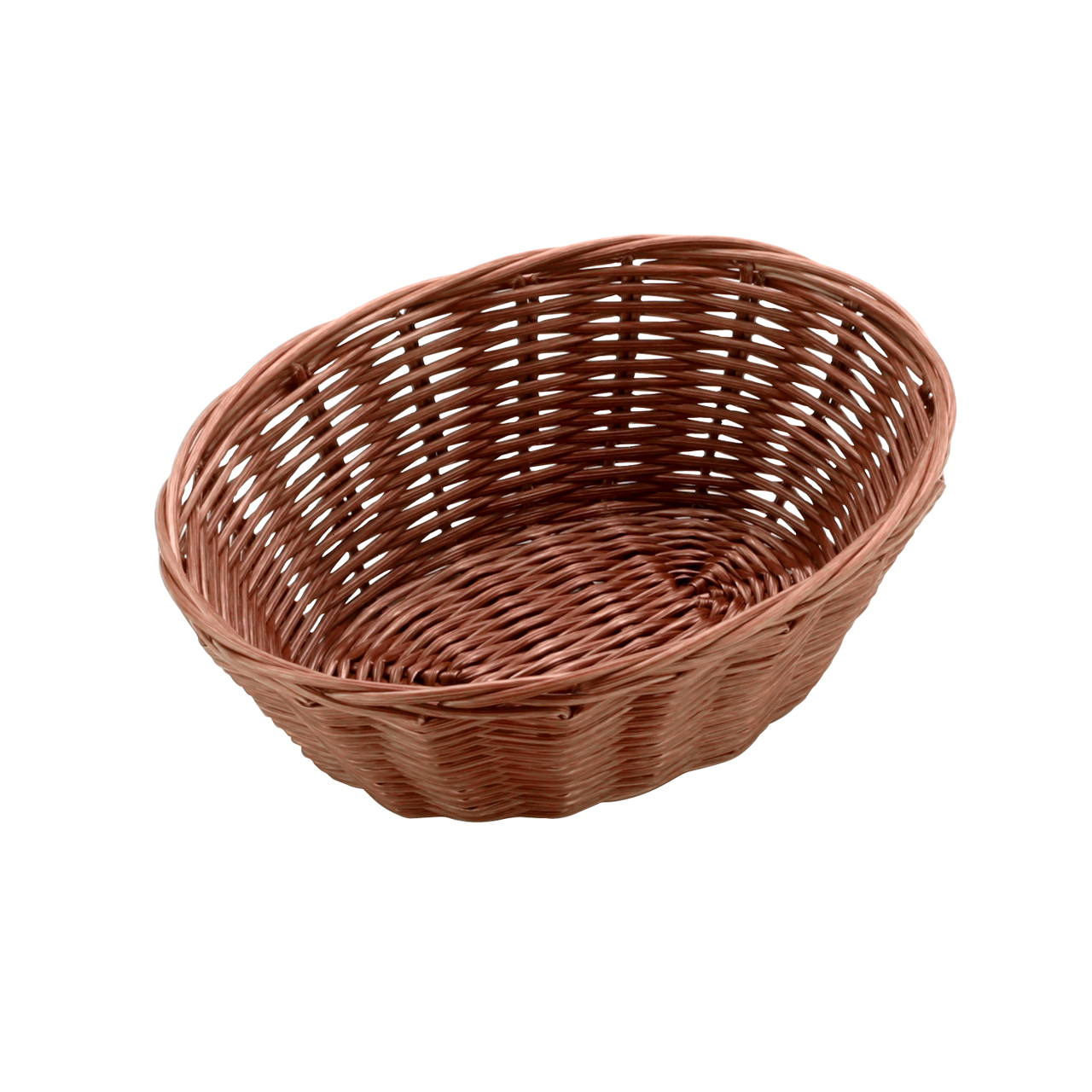 Heller ovaler Korb aus dunklem Polypropylen-Rattan. Größe 18 x 13 x 6,5 cm. Geeignet für Gebäck, Obst, Besteck.
