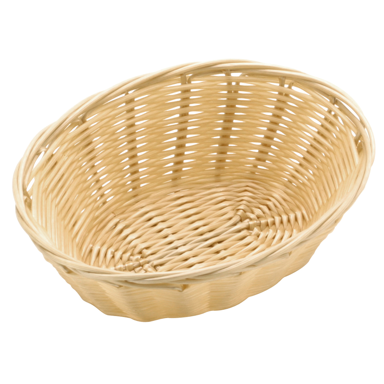 Leichter ovaler Korb aus leichtem Polypropylen-Rattan. Größe 18 x 13 x 6,5 cm. Geeignet für Gebäck, Obst, Besteck.
