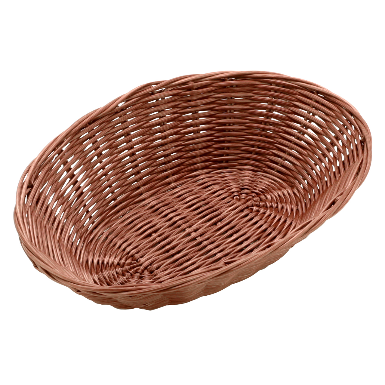 Heller ovaler Korb aus dunklem Polypropylen-Rattan. Größe 23 x 15 x 6,5 cm. Geeignet für Gebäck, Obst, Besteck.
