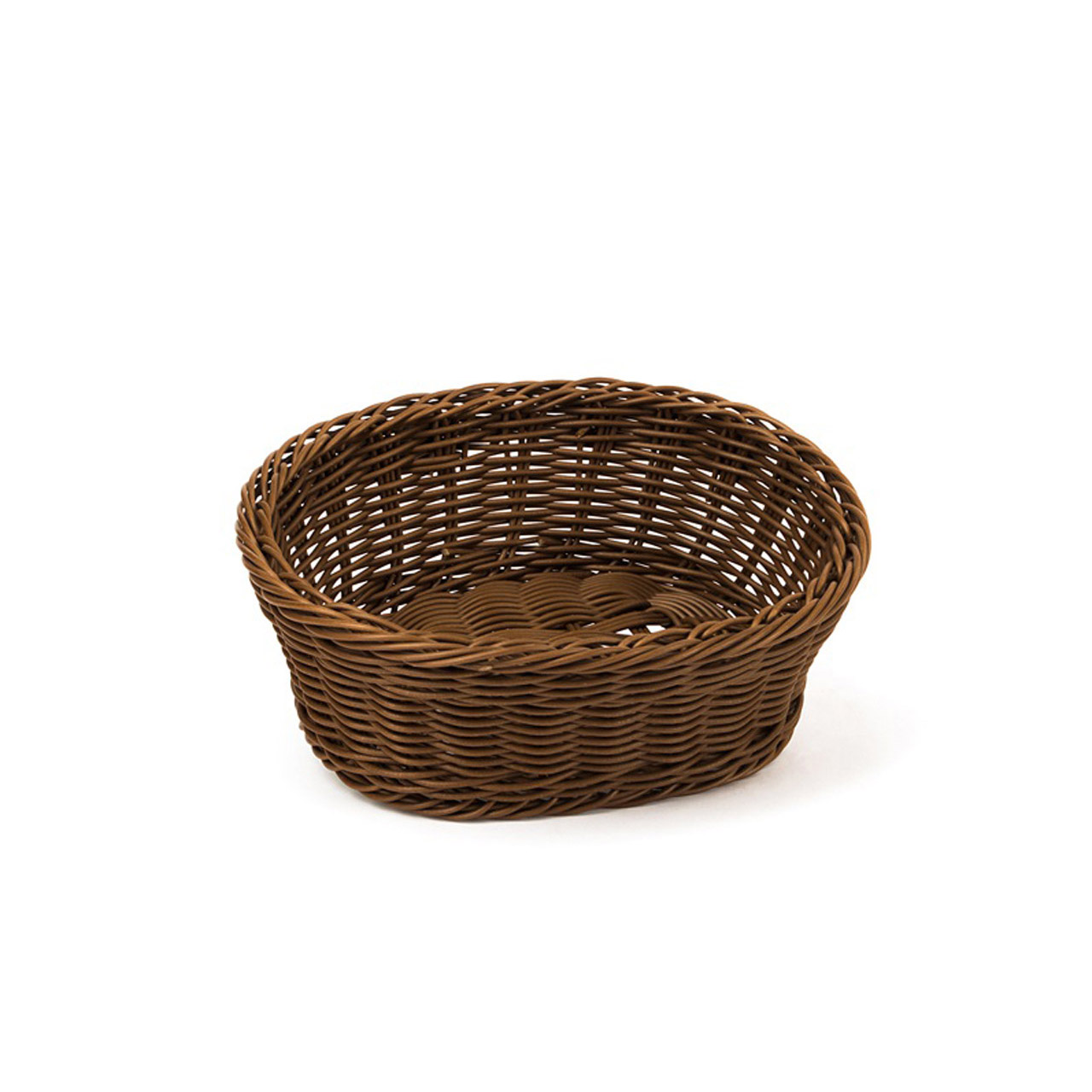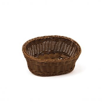 Ovaler Korb aus braunem Polyrattan. Sehr pflegeleicht, spülmaschinenfest. Größe 25 x 20 cm, Höhe 9 cm.