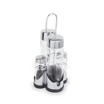 4-teiliges Set mit Essig und Öl, Salz und Pfeffer, aus Chrom-Nickel-Edelstahl, Edelstahl, Kunststoff und Glas. Ideal für den professionellen Einsatz in der Gastronomie. Hochwertige Materialien garantieren Langlebigkeit und Zuverlässigkeit.