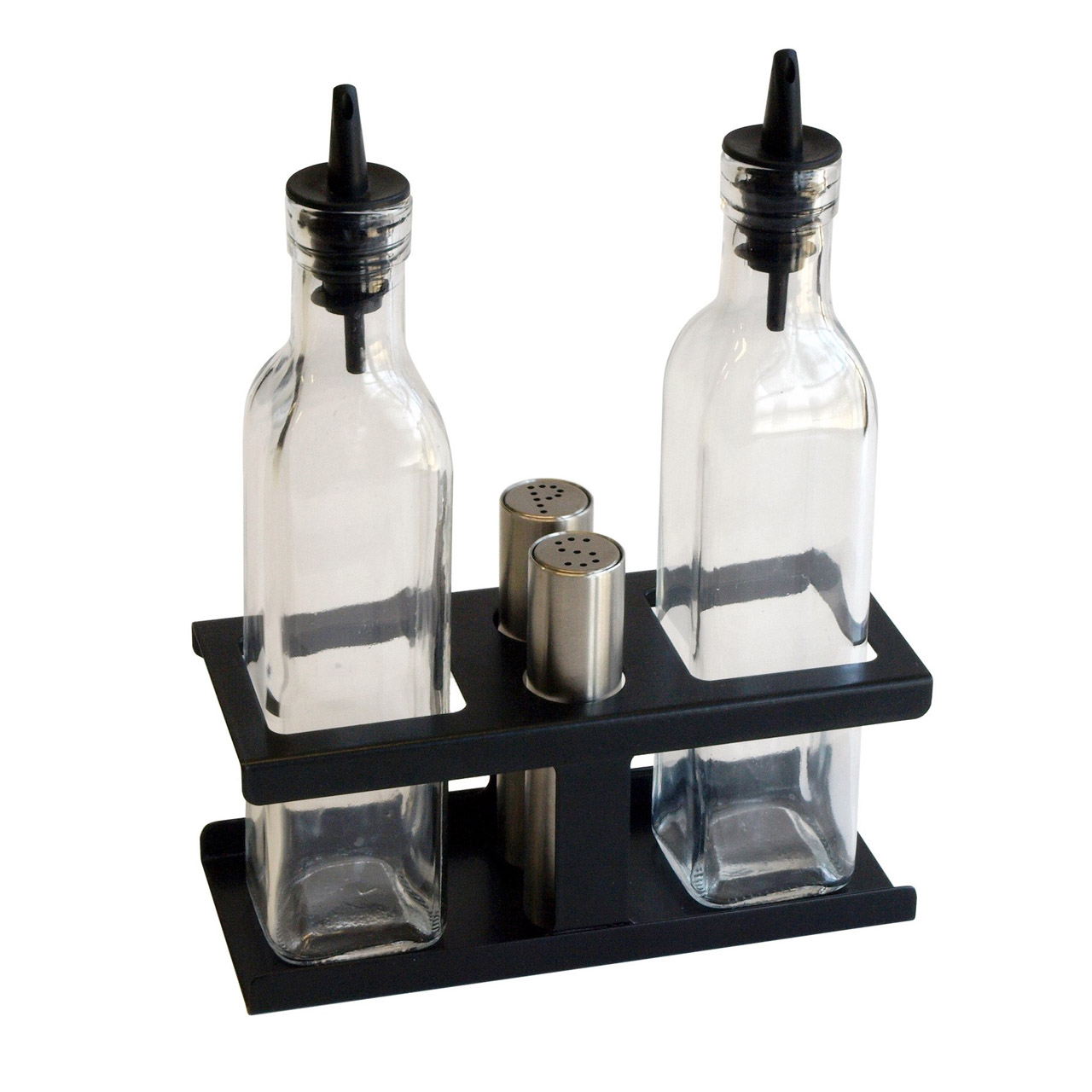 Tischgewürzset mit Stahlständer in Schwarz. Es umfasst Salz- und Pfefferstreuer aus Edelstahl sowie Öl- und Essigstreuer aus Glas mit schwarzem Kunststofftrichter. Kann in der Spülmaschine gewaschen werden.