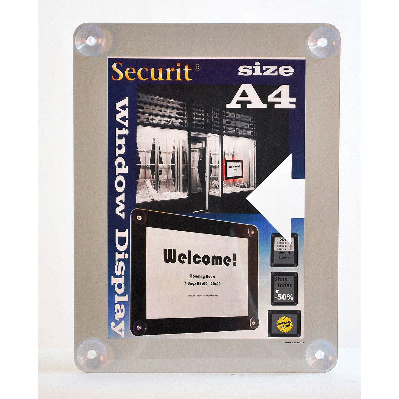 Der Glasrahmen aus Kunststoff dient zum einfachen Aufhängen gedruckter Informationen (z. B. Informationen zu Öffnungszeiten) auf dem Glas. Der Rahmen verfügt auf beiden Seiten über eine transparente Platte, in die bedruckte Papiere einfach durch Einschieben eingelegt werden. 4 Saugnäpfe sorgen für die Befestigung am Glas.