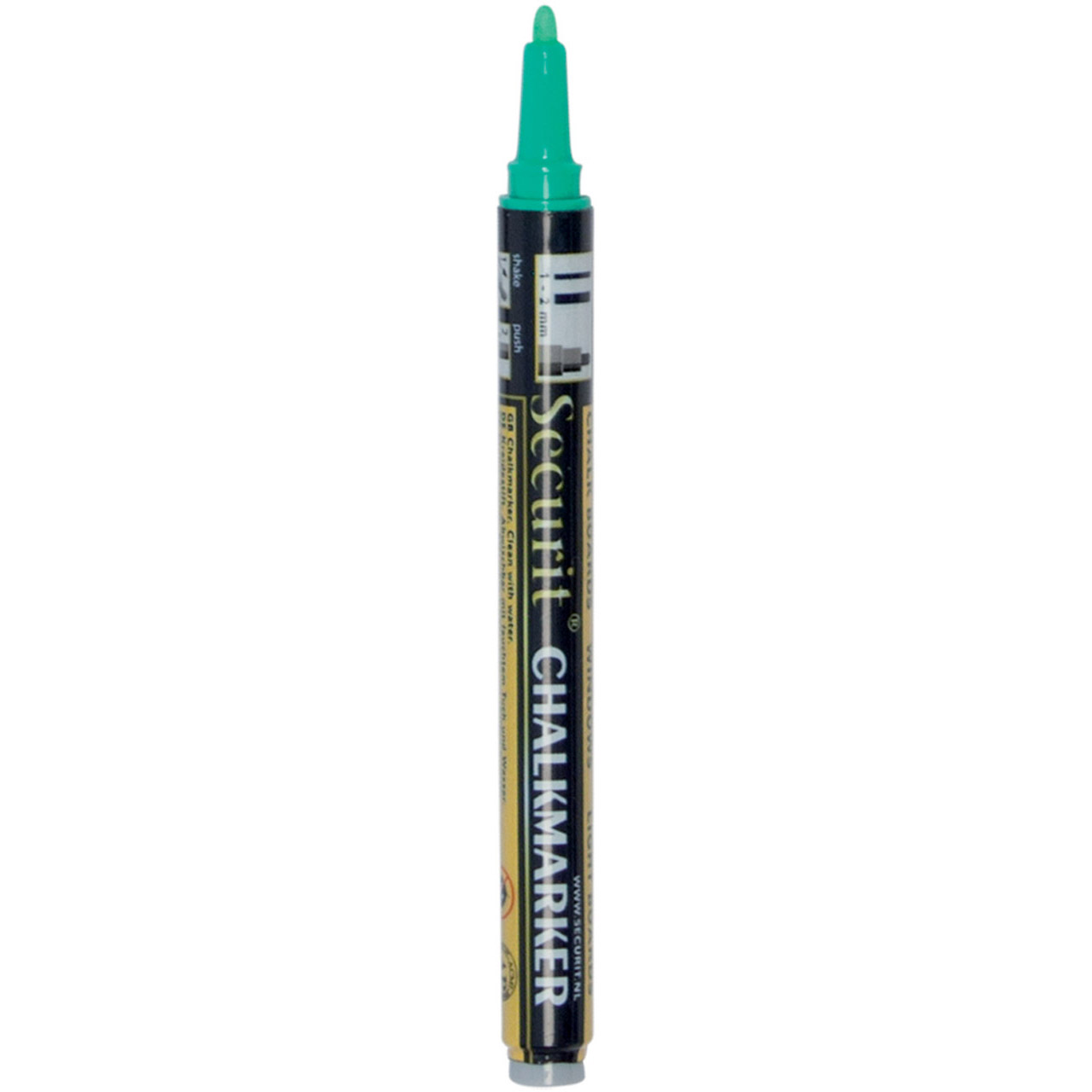 Kreide-Mikromarker, Spitzenbreite: 1 - 2 mm, grün. Nach dem Trocknen ist es beständig gegen Verschmieren, Ausbleichen und Abwaschen durch leichten Regen. Es wird mit einem Schwamm gereinigt.