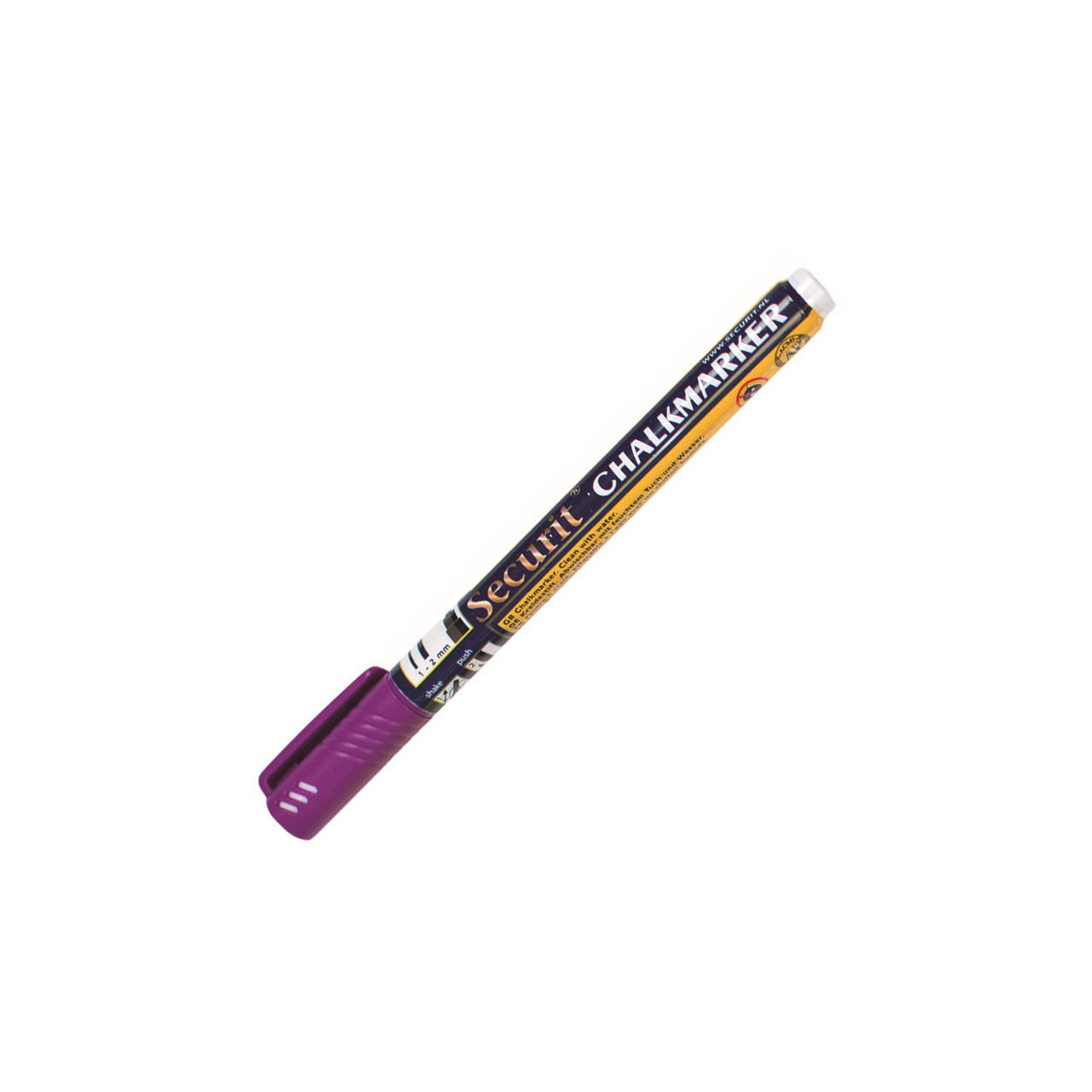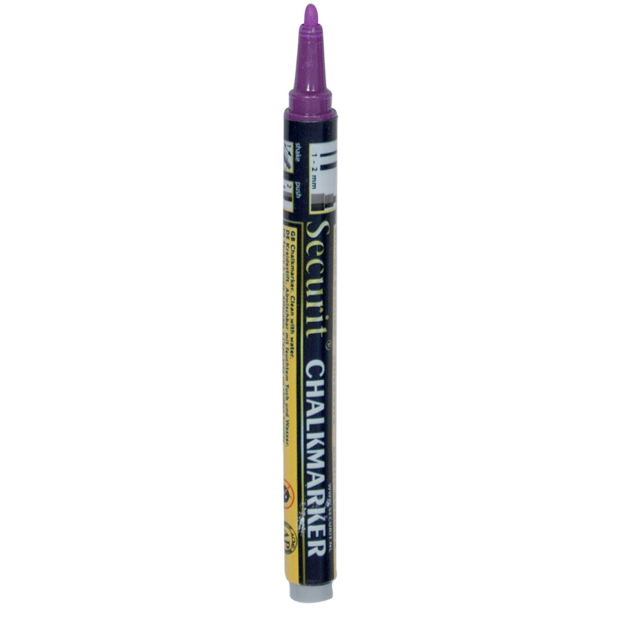 Kreide-Mikromarker, Spitzenbreite: 1 - 2 mm, lila. Nach dem Trocknen ist es beständig gegen Verschmieren, Ausbleichen und Abwaschen durch leichten Regen. Es wird mit einem Schwamm gereinigt.