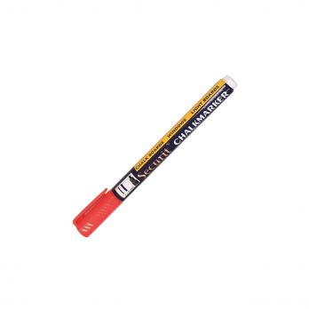Kreide-Mikromarker, Spitzenbreite: 1 - 2 mm, rot. Nach dem Trocknen ist es beständig gegen Verschmieren, Ausbleichen und Abwaschen durch leichten Regen. Es wird mit einem Schwamm gereinigt.