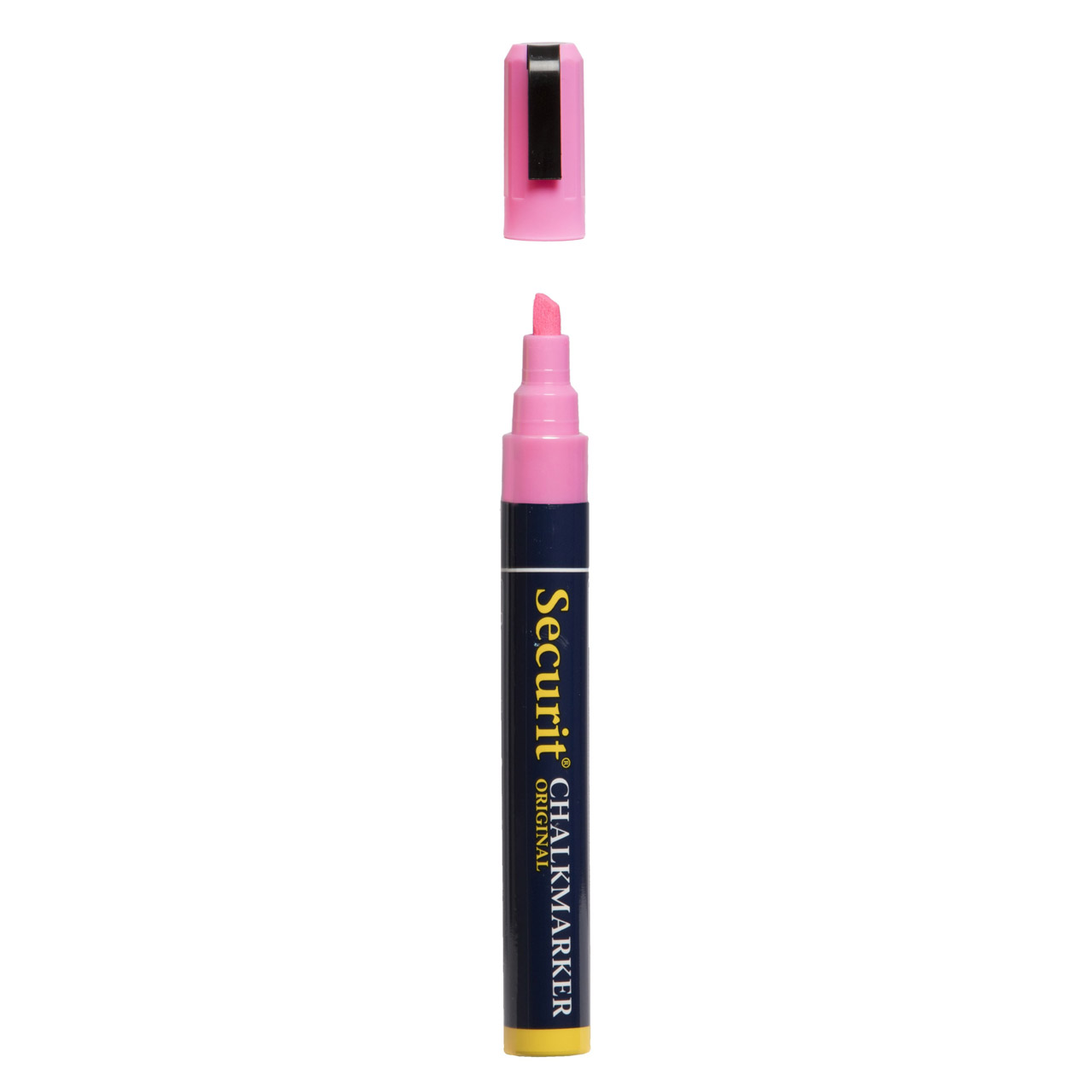 Mittlerer Kreidemarker, Spitzenbreite: 2 - 6 mm, rosa. Nach dem Trocknen ist es beständig gegen Verschmieren, Ausbleichen und Abwaschen durch leichten Regen. Es wird mit einem Schwamm gereinigt.