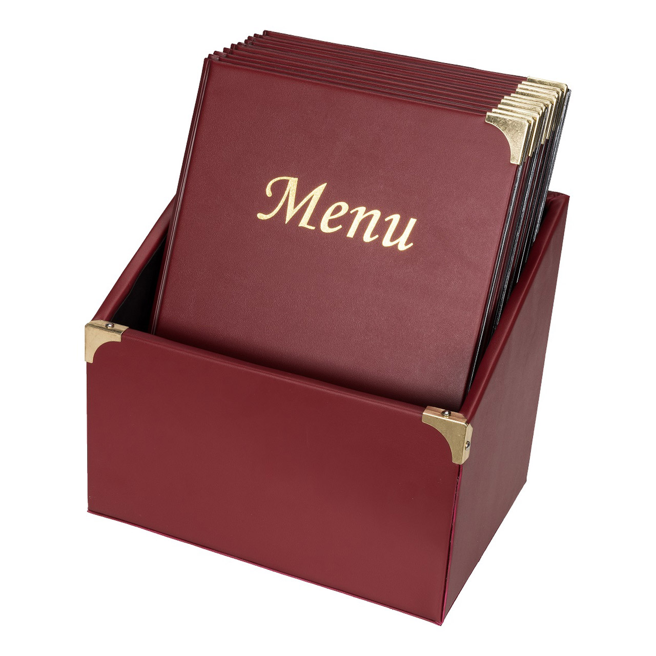 Schachtel mit 10 Speisekarten A4, mit 4 Einlagen (insgesamt 10 Seiten), keine zusätzliche Einlage möglich, bordeauxrot