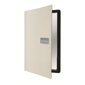 Moderne, elegante Menütafeln aus geklebtem Leder mit auswechselbaren Einlagen. Die Teller sind mit einem Metallschild mit der Aufschrift MENU gekennzeichnet. Jedes Stück wird mit einem leeren, selbstklebenden Metalletikett geliefert. Möchte der Kunde das Produkt personalisieren, kann er den Namen oder das Logo des Restaurants auf das Etikett prägen lassen und dieses über das vorhandene Etikett kleben. Im Lieferumfang ist 1 Beilage für insgesamt 4 Angebotsseiten enthalten. Weitere Einlagen im 10er-Pack finden Sie unter der Nummer 100023066.