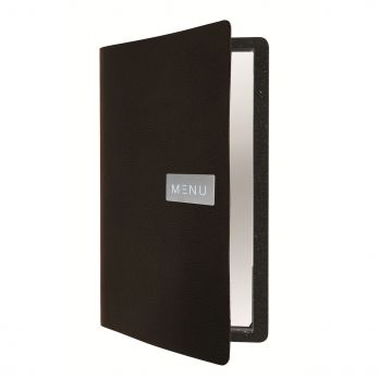 Moderne, elegante Menütafeln aus geklebtem Leder mit auswechselbaren Einlagen. Die Teller sind mit einem Metallschild mit der Aufschrift MENU gekennzeichnet. Jedes Stück wird mit einem leeren, selbstklebenden Metalletikett geliefert. Möchte der Kunde das Produkt personalisieren, kann er den Namen oder das Logo des Restaurants auf das Etikett prägen lassen und dieses über das vorhandene Etikett kleben. Im Lieferumfang ist 1 Beilage für insgesamt 4 Angebotsseiten enthalten. Weitere Einlagen im 10er-Pack finden Sie unter der Nummer 100023066.