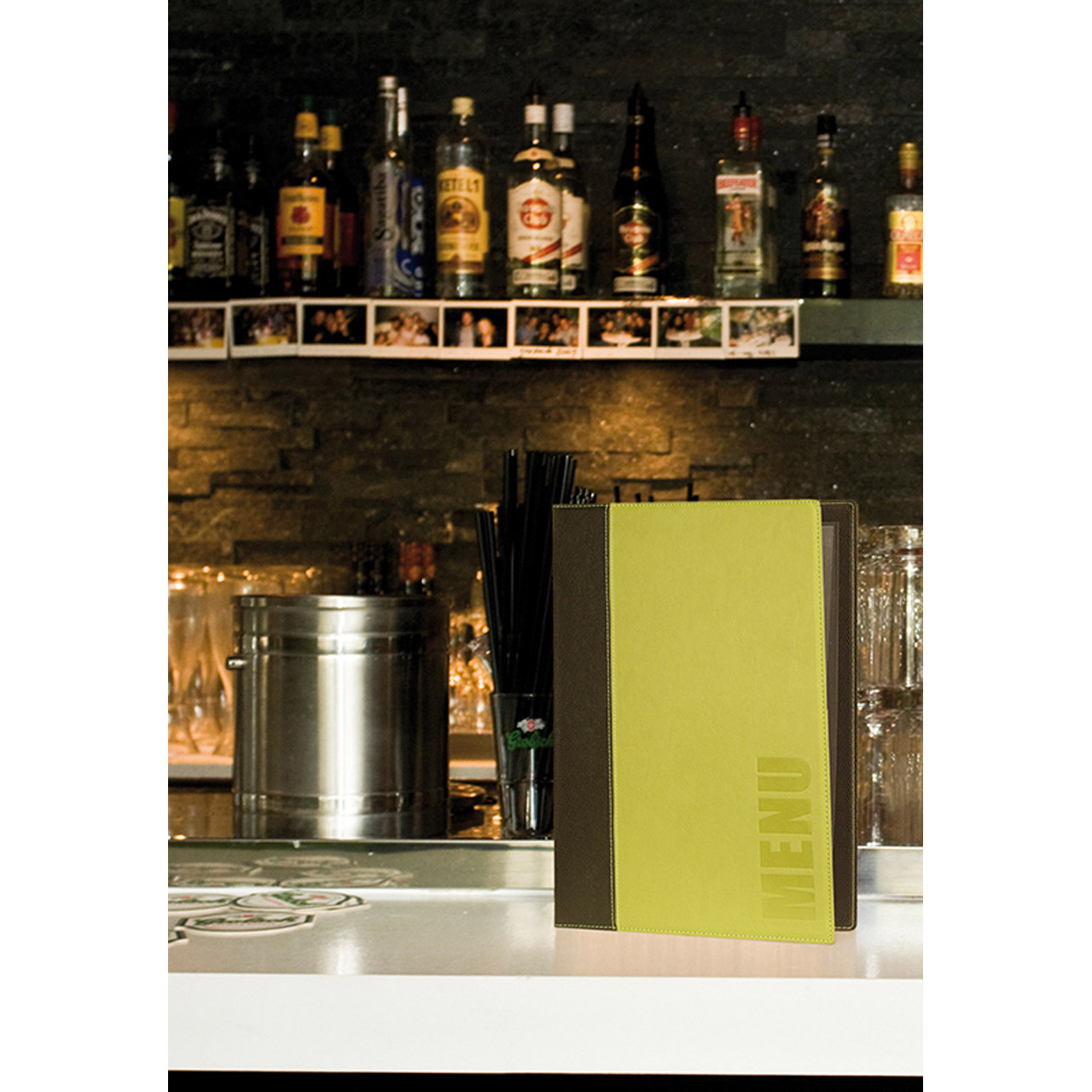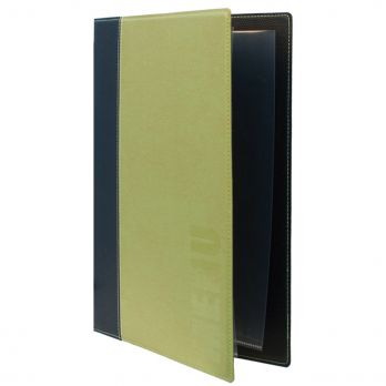 Speisekarte im A4-Format in modernem Design aus Kunstleder. Der Anhang ermöglicht das Hinzufügen oder Ändern der Beilagen, die jeweils 4 Seiten des Angebots enthalten. Die Blätter sind zweifarbig, mit dunklem Rand am Rücken, die gedruckten Inschriften sind dunkel, vertikal ausgerichtet. Die Innenseiten haben ein Strukturmuster. Weitere Einlagen im 10er-Pack finden Sie unter der Nummer 100023066.