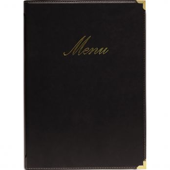 Menükarten der CLASSIC-Serie im A4-Format bestehen aus Lederimitatmaterial. Die Produkte der CLASSIC-Serie verfügen über Kantenschutzecken aus Metall, die vor allem in Restaurants mit hohem Gästeverkehr geschätzt werden. Die Speise- und Getränkekarten der CLASSIC-Serie sind mit einer geprägten Aufschrift in Goldfarbe bedruckt. Im Lieferumfang ist 1 Beilage für insgesamt 4 Angebotsseiten enthalten. Weitere Einlagen im 10er-Pack finden Sie unter der Nummer 100023066.