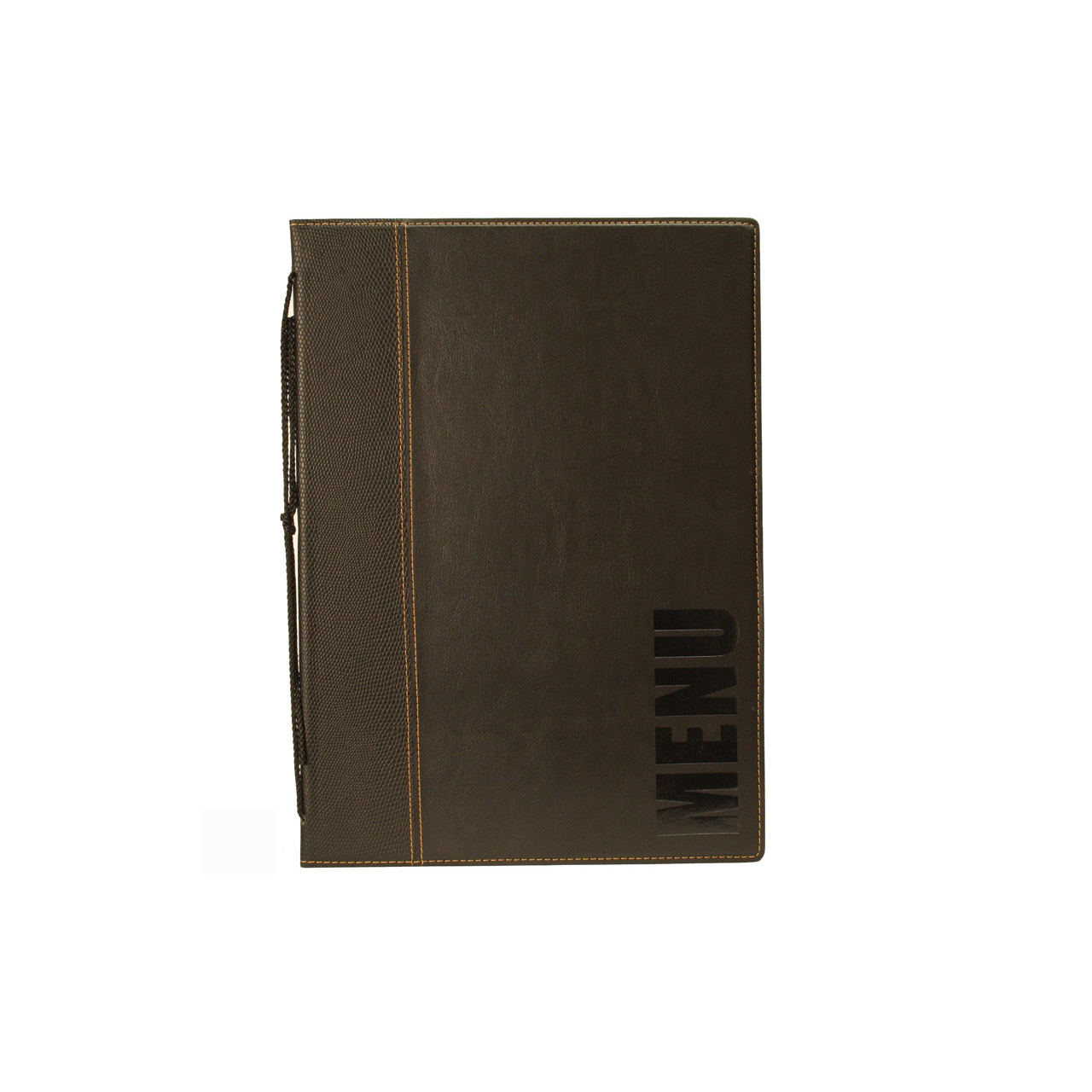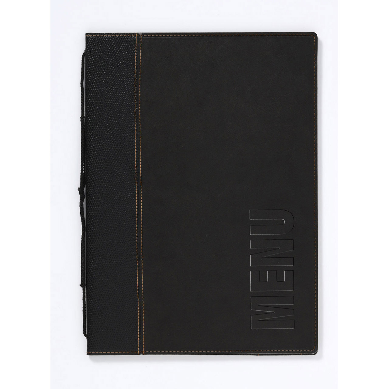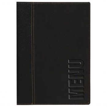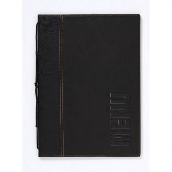 Speisekarte im A4-Format in modernem Design aus Kunstleder. Durch die Befestigung können Sie die Einlagen hinzufügen oder austauschen, die jeweils 4 Seiten der Speisekarte enthalten. Die Blätter sind zweifarbig, mit dunklem Rand am Rücken, die gedruckten Inschriften sind dunkel, vertikal ausgerichtet. Die Innenseiten haben ein Strukturmuster. Weitere Einlagen im 10er-Pack finden Sie unter der Nummer 100023066.