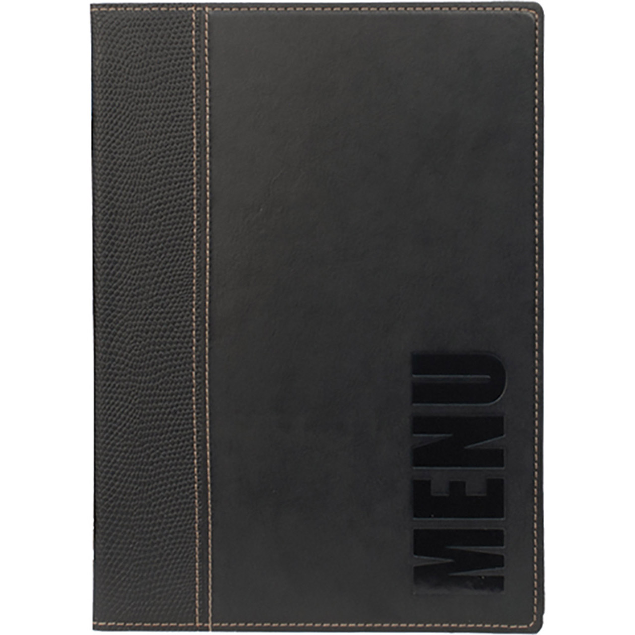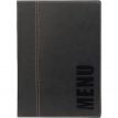 Speisekarte im A5-Format in modernem Design aus Kunstleder. Der Anhang ermöglicht das Hinzufügen oder Ändern der Beilagen, die jeweils 4 Seiten des Angebots enthalten. Die Blätter sind zweifarbig, mit dunklem Rand am Rücken, die gedruckten Inschriften sind dunkel, vertikal ausgerichtet. Die Innenseiten haben ein Strukturmuster. Weitere Einlagen im 10er-Pack finden Sie unter der Nummer 100023070.