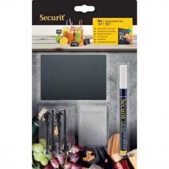 20 schwarze A7-Etiketten (waschbar) + 1 weißer Marker und 6 Ständer