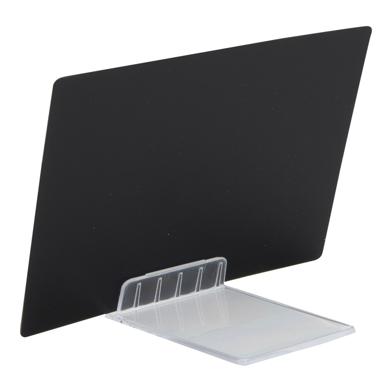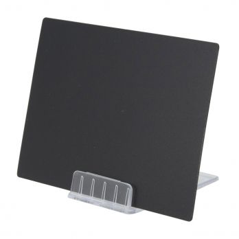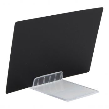 Zusätzliche beschreibende schwarze Kunststofftabellen im A7-Format. Tische werden im 20er-Set verkauft. Dieses Set enthält einen weißen Marker, 4 Steckmarker und 2 transparente Ständer.