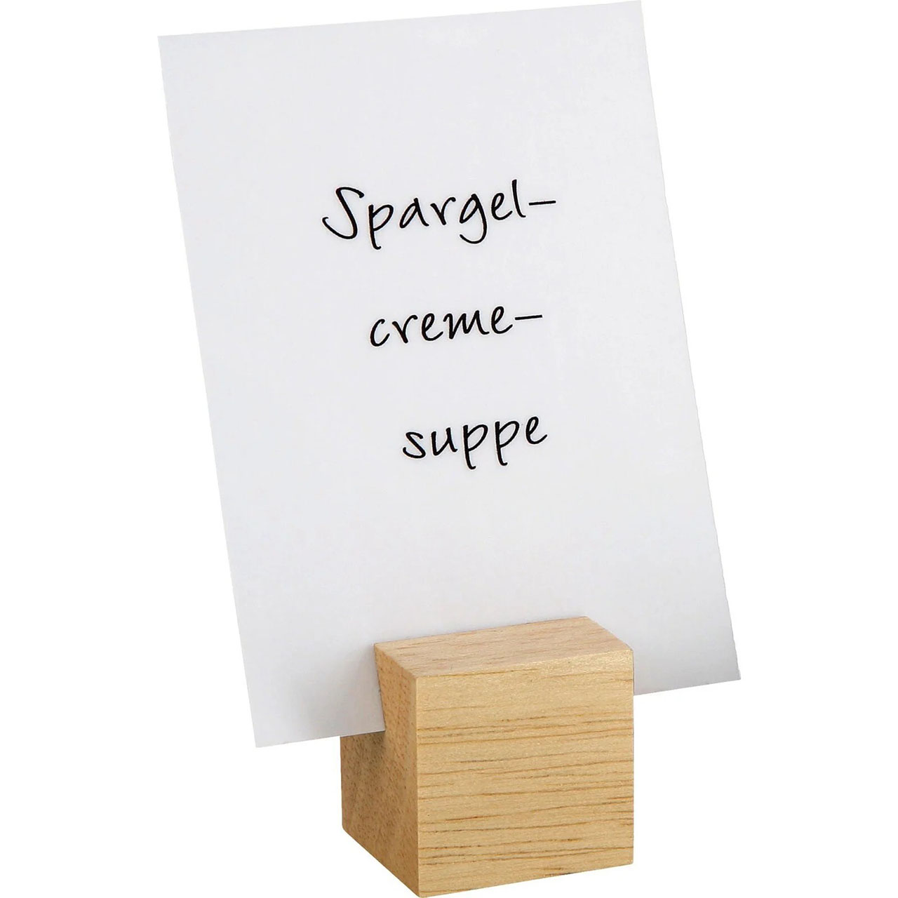 Menüständer aus Holz. Maße: 3 x 3 x 3 cm.