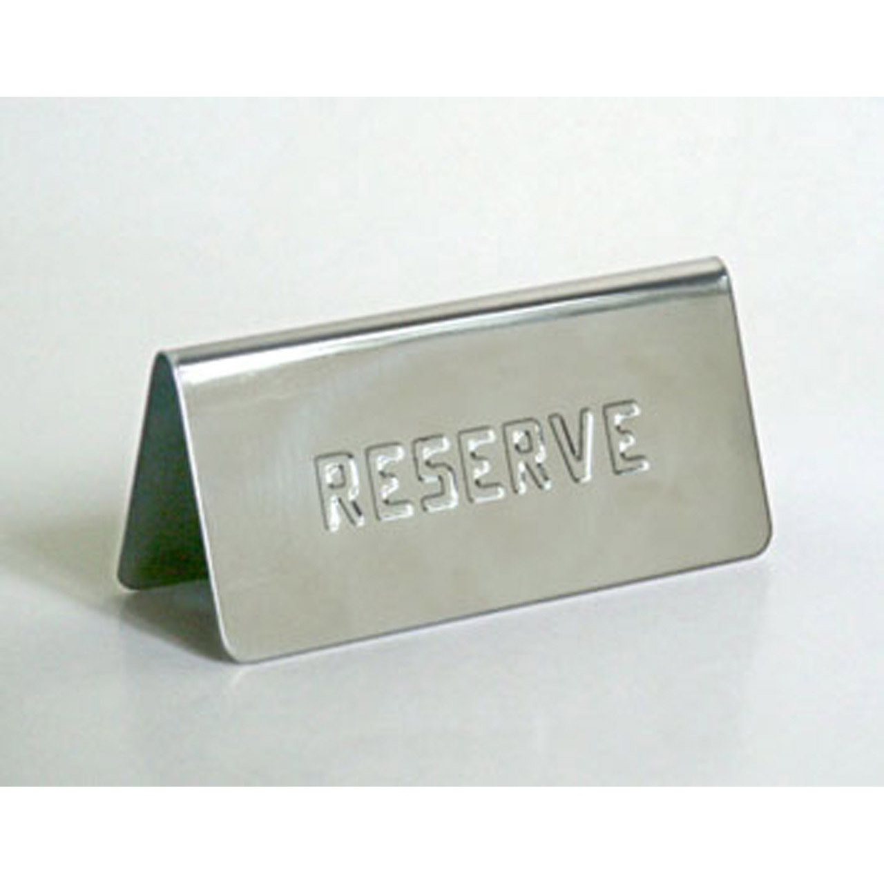 Tisch aus Edelstahl für Reservierungen mit der Aufschrift RESERVE, Maße 11,7 x 5,6 cm, Höhe 5,8 cm.