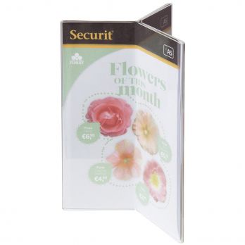 Schlichter dreiseitiger Tischständer für Prospekte aus transparentem Kunststoff. A5-Format.