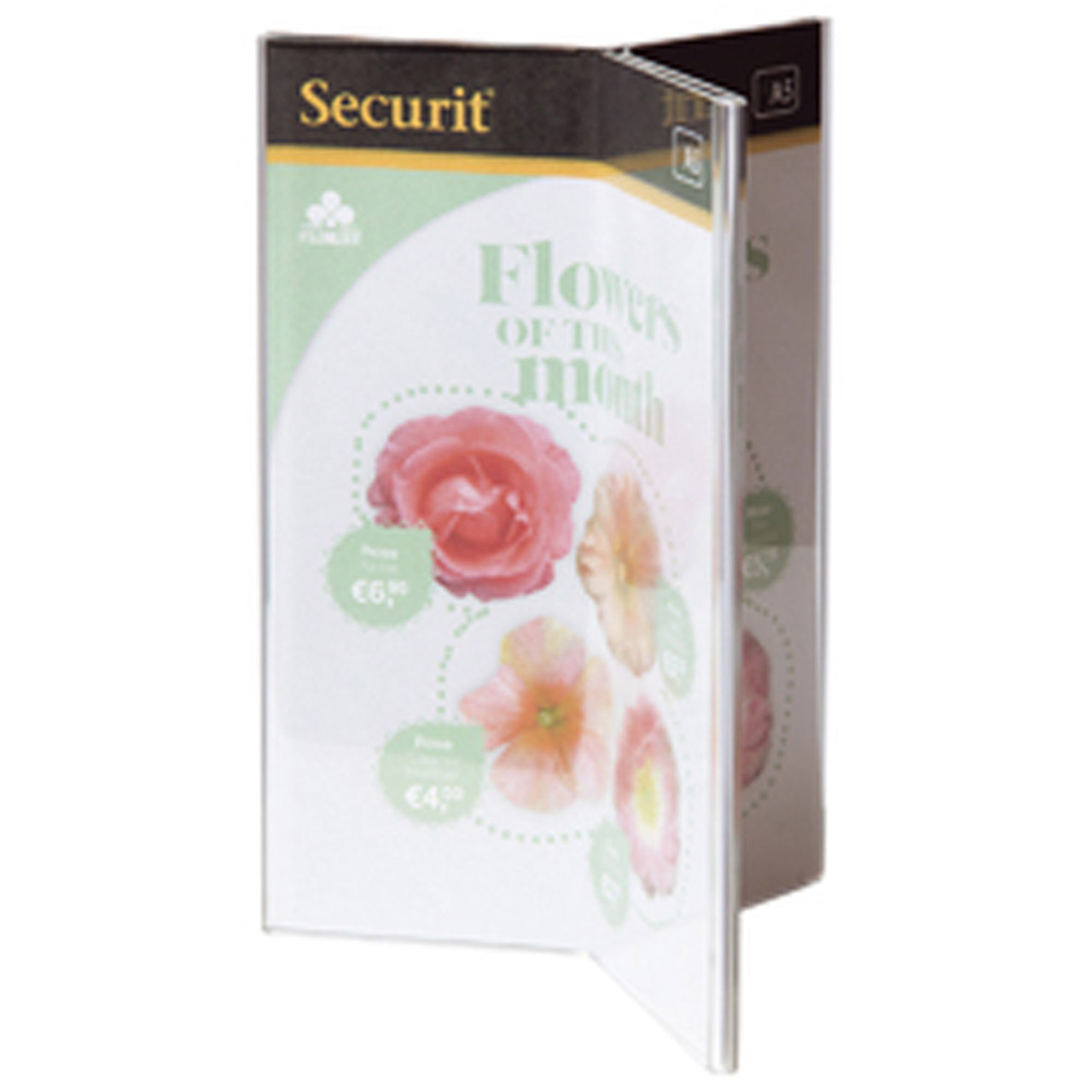 Schlichter dreiseitiger Tischständer für Prospekte aus transparentem Kunststoff. A6-Format.