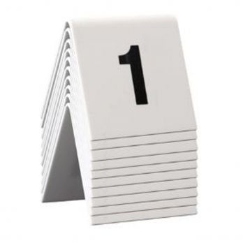 Tische auf dem Tisch unterscheiden. Sie bestehen aus weißem Kunststoff mit schwarzen Zahlen 1 bis 10.