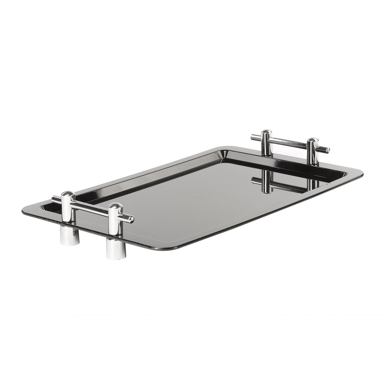 Schwarzes Kunststofftablett/Tablett mit silberfarbenen Polycarbonatgriffen. Größe 32,5 x 53 cm.