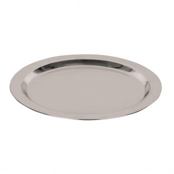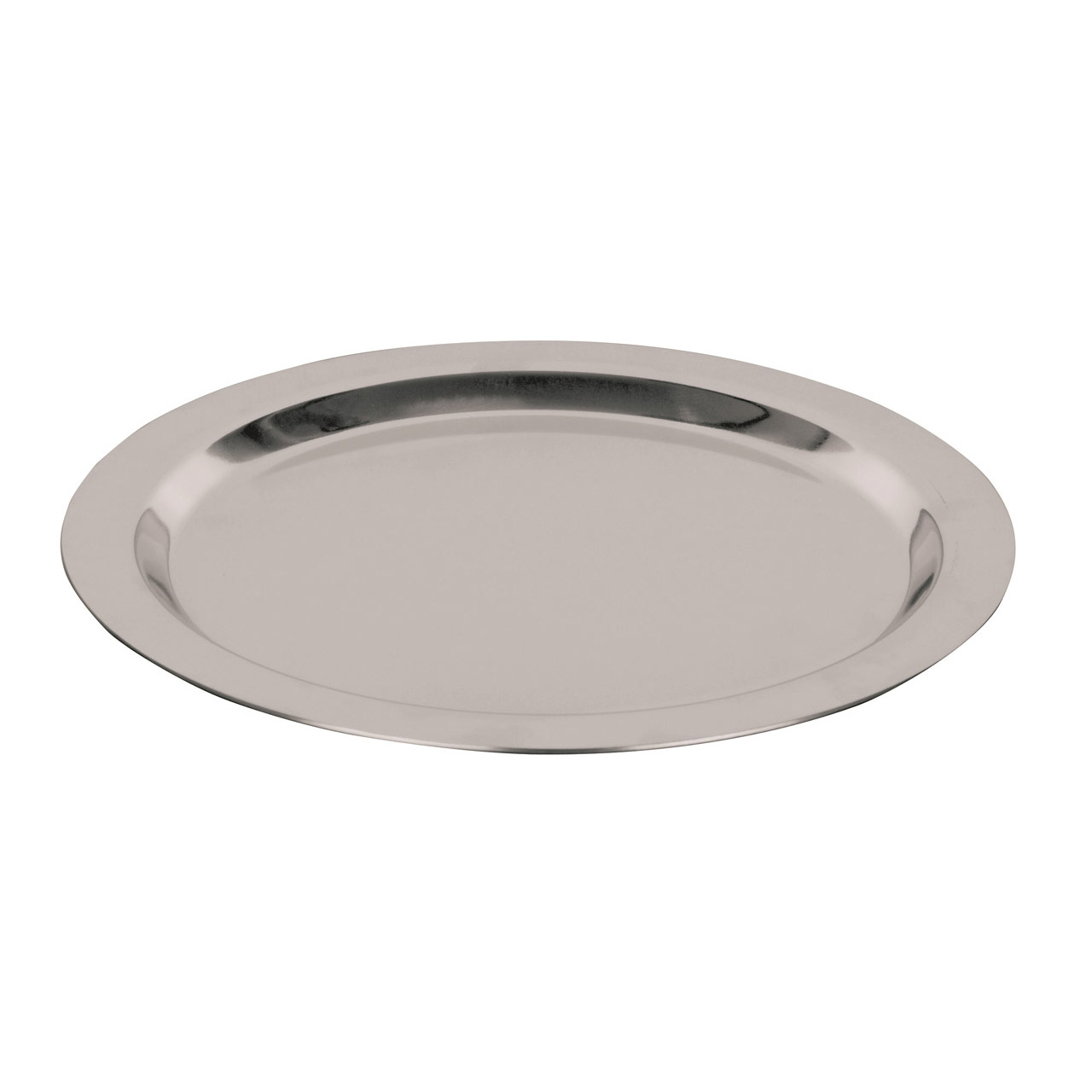 Rundes Serviertablett aus Edelstahl mit einem Durchmesser von 32 cm, Höhe 2 cm.
