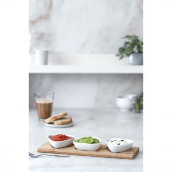 Das Servierset mit Bambustablett und drei tropfenförmigen Porzellanschalen besticht durch sein modernes und natürliches Design. Die Kombination aus hellem Bambusholz und elegantem weißen Porzellan ergibt ein harmonisches Gesamtbild, das klar, stilvoll und natürlich wirkt und sich perfekt in moderne und ungezwungene Esskultur einfügt. Nicht spülmaschinengeeignet. Das Set eignet sich ideal zum Servieren kleiner Portionen, Vorspeisen, Dips, Saucen, Gewürze oder Marmeladen und ist sowohl für die Gastronomie als auch für den privaten Gebrauch bestens geeignet. Jede Schale fasst ca. 80 ml, und dank der praktischen Anordnung auf dem Tablett gelingt das Servieren übersichtlich und elegant. Das Bambustablett ist nicht spülmaschinengeeignet, die Porzellanschalen hingegen sind pflegeleicht und langlebig.