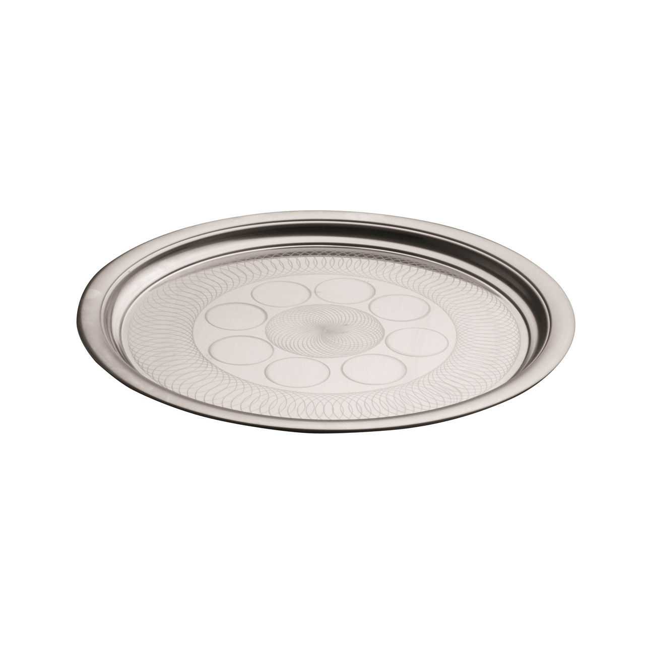 Rundes Tablett aus Edelstahl. Durchmesser 32 cm, Höhe 2 cm.
