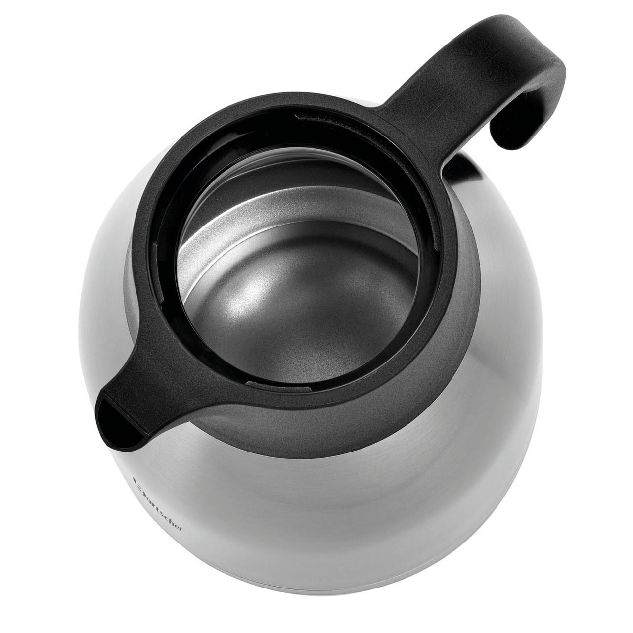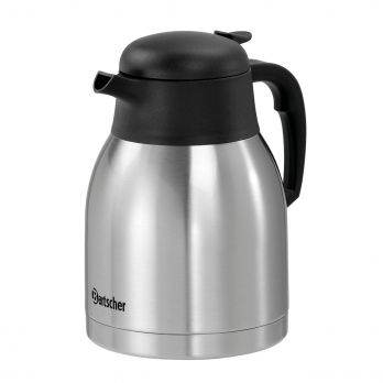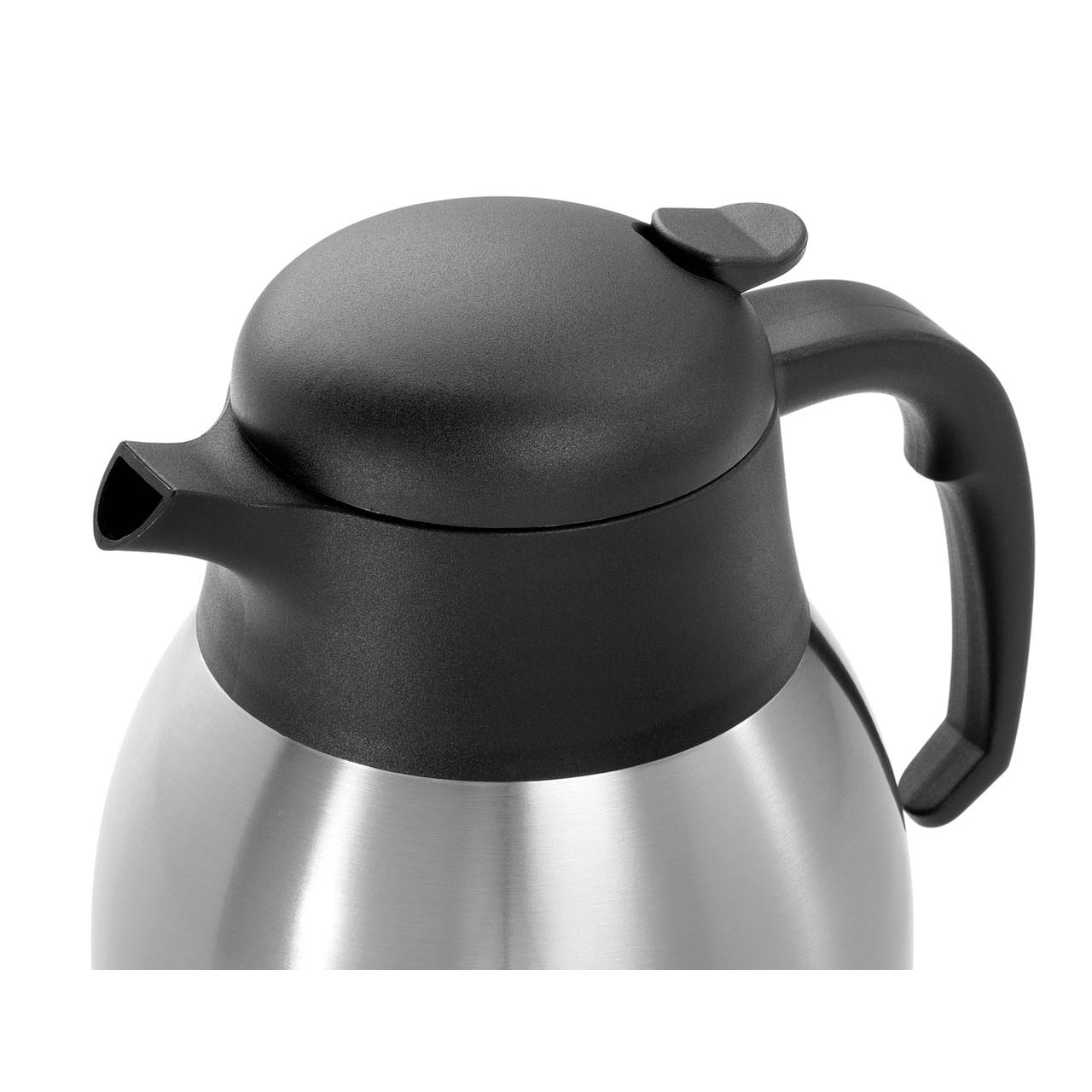 Isolierkanne aus Edelstahl mit schwarzem Kunststoffgriff. Farbe: Chrom/Schwarz. Ausguss zum einfachen Befüllen und Reinigen. Fassungsvermögen: 1,5 Liter. Abmessungen: Durchmesser mit Griff 170 mm, Höhe 215 mm. Gewicht: 0,72 kg.