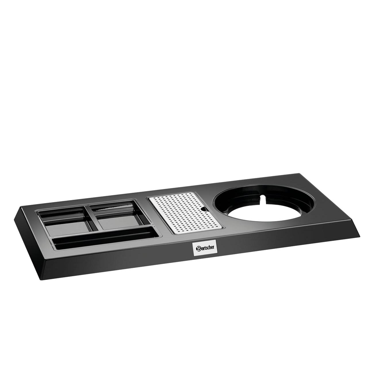 Station für einen Bartscher Wasserkocher 0,6 l (matt) oder 0,8 l (glänzend). Farbe: Schwarz matt oder glänzend, Material: robuster Kunststoff. Lieferung ohne Wasserkocher und Zubehör (siehe Abbildung). Durchmesser des Wasserkochers: 145 mm. Drei Fächer für Teebeutel, Instantkaffee, Zucker, Löffel oder Rührstäbchen. Kabelmanagement im Sockel. Inklusive Abtropfschale. Abmessungen: B 465 x T 225 x H 30 mm. Gewicht: 0,912 kg.
