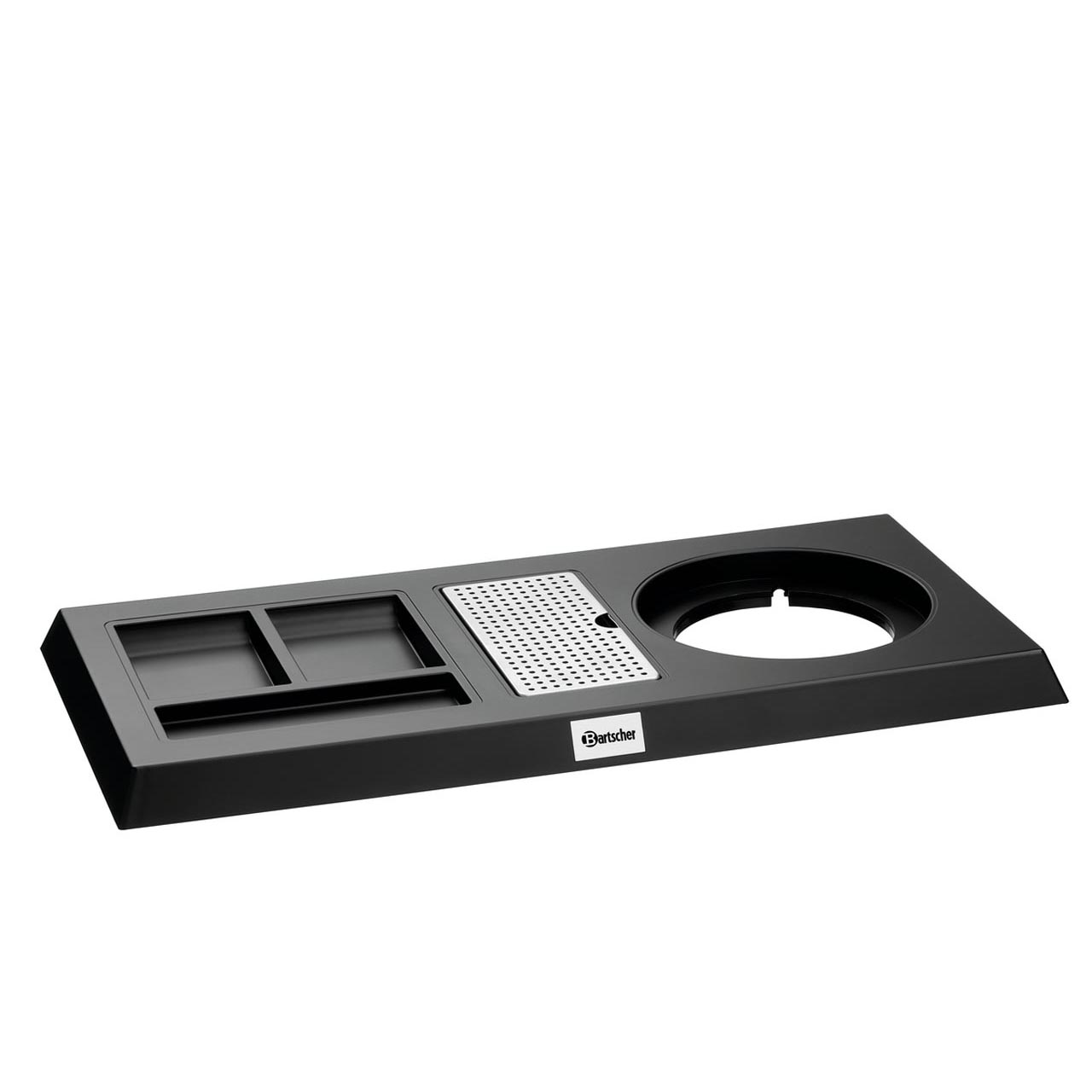 Station für einen Bartscher Wasserkocher 0,6 l (matt) oder 0,8 l (glänzend). Farbe: Schwarz matt oder glänzend, Material: robuster Kunststoff. Lieferung ohne Wasserkocher und Zubehör (siehe Abbildung). Durchmesser des Wasserkochers: 145 mm. Drei Fächer für Teebeutel, Instantkaffee, Zucker, Löffel oder Rührstäbchen. Kabelmanagement im Sockel. Inklusive Abtropfschale. Abmessungen: B 465 x T 225 x H 30 mm. Gewicht: 0,912 kg.