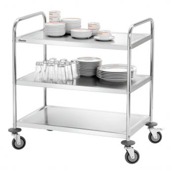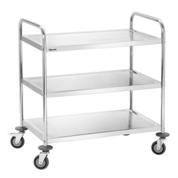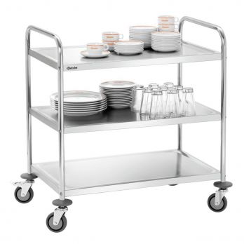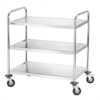 Der Bartscher Servierwagen mit 3 Ablagen ist der ideale Helfer für Küchen und Restaurants. Material: Chrom-Nickel-Edelstahl. Ausgestattet mit 4 Rädern (Durchmesser 10 cm), davon 2 mit Bremsen. Die Räder sind aus robustem Vollgummi gefertigt. Lieferung erfolgt zerlegt – einfache Montage. – 3 Ablagen – Ablagenmaße: 827 x 510 mm; Abstand zwischen den Ablagen: 265 mm – Tragkraft pro Ablage: 30 kg – Gestell aus Rundrohr, Durchmesser 25,8 mm – 4 Stoßdämpfer aus Kunststoff – Abmessungen: B 920 x T 600 x H 945 mm – Gewicht: 13,4 kg
