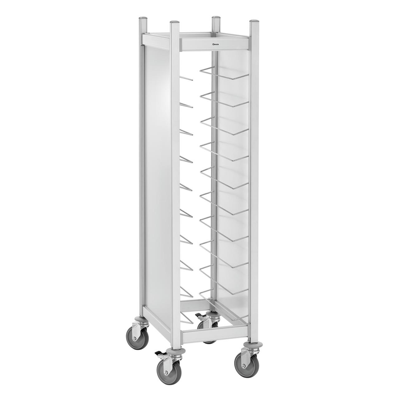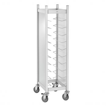 Der 10-teilige Regalwagen ist aus Aluminium gefertigt, die Seitenwände bestehen aus robustem Kunststoff. Tabletts können von beiden Seiten eingesetzt werden. Die Seitenwände sind beschreibbar. Robuste Ausführung. Geeignet für Tabletts der Größe GN 1/1 (530 x 325 mm). Abstand zwischen den Fächern: 115 mm. Maximale Tragkraft pro Fach: 10 kg. 4 Rollen, davon 2 mit Bremsen (Raddurchmesser 120 mm).