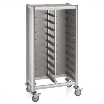 Einzelner MENSA Tablettwagen für 2 x 10 Tabletts, silberfarben, 86 x 51 x 165 cm, MDF-Holzdekor/Aluminium. Ideal für den professionellen Einsatz in der Gastronomie. Hochwertiges Material garantiert Langlebigkeit und Zuverlässigkeit.
