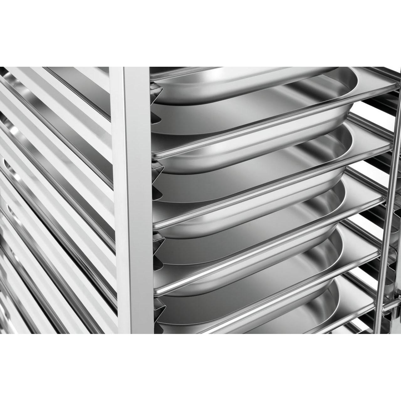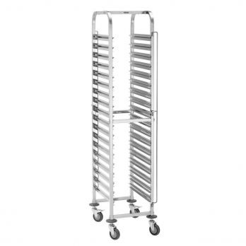 Transportwagen für Gastronormbehälter und -schalen der Größen GN 1/1, 1/2 und 1/3. Geeignet für Gastronormbehälter bis 65 mm Tiefe. Gefertigt aus Chrom-Nickel-Stahl. Einfache Montage. Die Rahmen bestehen aus Vierkantrohren (25,8 x 25,8 mm). Der Abstand zwischen den einzelnen Einsätzen beträgt 80 mm. Die maximale Tragfähigkeit des gesamten Wagens beträgt 80 kg, die Tragfähigkeit eines einzelnen Einsatzes 10 kg. Ausgestattet mit 4 schwenkbaren Gummirädern (100 mm Durchmesser), davon 2 mit Bremsen. Abmessungen: 450 x 613 x 1895 mm (B x T x H). Gewicht: 20,2 kg. Gastronormbehälter sind nicht im Lieferumfang enthalten.