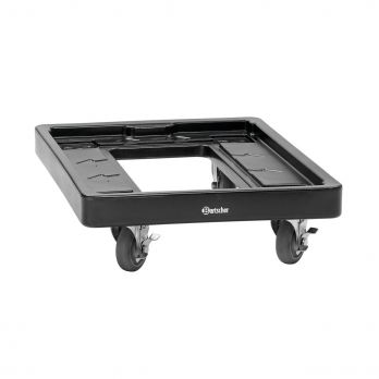 Fahrgestellgröße 550 x 725 mm, passend für Bartscher-Thermobehälter. Wagen (Fahrgestell) mit 4 Rädern (100 mm Durchmesser), davon 2 gebremst. Lieferung erfolgt montiert. Maximale Traglast: 200 kg. Bodenfläche mit erhöhtem Rand. Material: Robuster Kunststoff. Farbe: Schwarz. Praktisches Fahrgestell für einfaches Handling und Transportieren der Thermoboxen GN110-1 und GN110-12. Der erhöhte Rand am Transportwagen verhindert das Verrutschen der Thermobehälter. – Ablagefläche: B 490 x T 660 mm – Rahmenhöhe: 25 mm. Abmessungen: B 720 x T 540 x H 194 mm. Gewicht: 6,2 kg.