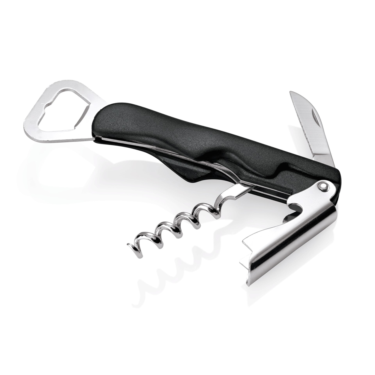 Das klassische Design des Kellneröffners mit Kronenöffner für Metallkorken in Schwarz. Die Länge des Öffners beträgt 13,5 cm. Ein Korkenzieher zum Verkorken von Weinflaschen und ein Messer sind ebenfalls im Lieferumfang enthalten. Der Griff besteht aus PVC. Material Chrom.