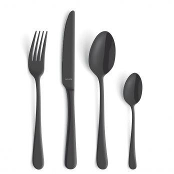 Speisemesser aus 18/0-Edelstahl mit schwarzem Finish, das dem Besteck ein modernes, luxuriöses Aussehen verleiht. PVD-Oberflächenbehandlung – das Besteck verfügt über eine dünne Titanbeschichtung, die für lebendige Farben sorgt.