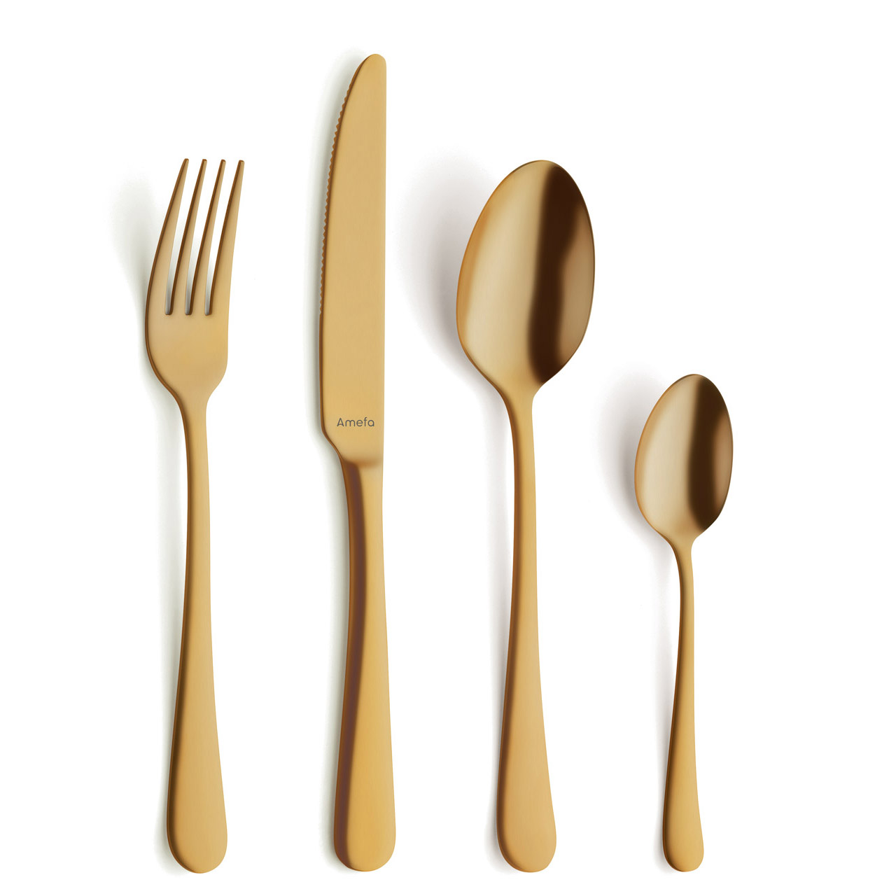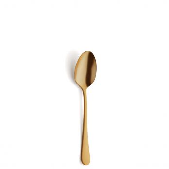 Dessertlöffel aus Edelstahl 18/0 mit Goldfinish, der dem Besteck ein modernes, luxuriöses Aussehen verleiht. PVD-Oberflächenbehandlung – das Besteck verfügt über eine dünne Titanbeschichtung, die für lebendige Farben sorgt.