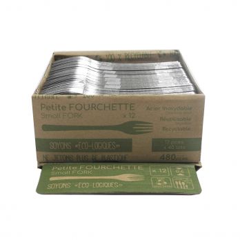 Minigabel aus rostfreiem Stahl der Stärke 0,6 mm, geeignet als Ersatz für Einwegbestecke aus Kunststoff – voll abbaubares Material, dank der Geschirrspülbeständigkeit auch wiederholt verwendbar, geliefert in Packungen zu je 12 Stück