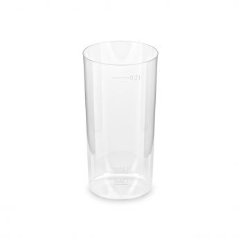 Krystal-Becher (PS) Longdrink mit einem Volumen von 0,2 Litern mit einer Linie zu 0,02 l/0,04 l. Durchmesser 56 mm.