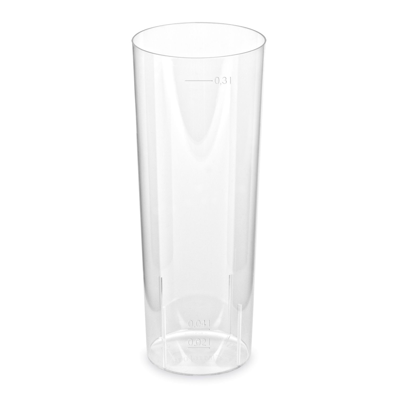 Krystalbecher (PS) Longdrink mit einem Volumen von 0,3 l und einer Linie für 0,02 l/0,04 l Durchmesser 59 mm.